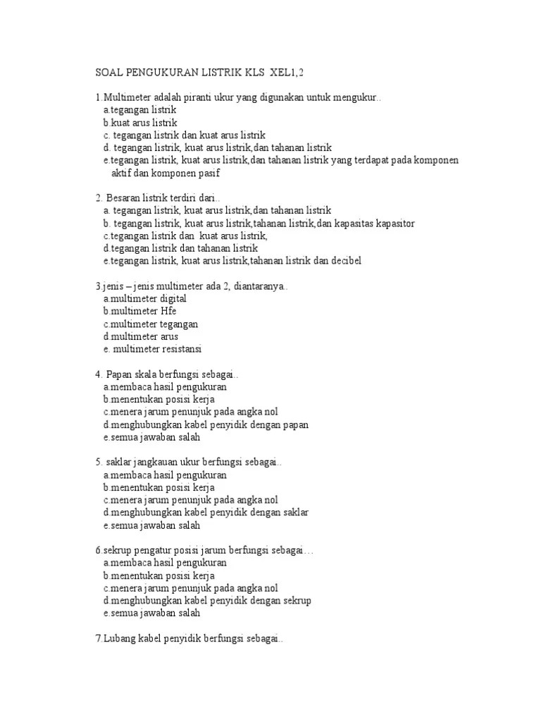 Pilihan ganda pilihlah salah satu jawaban yang paling benar ! Yang disesuaikan dengan kompetensi yang terbaru . Proses/sistem atau mendapatkan informasi tentang nilai dari suatu. Berikut contoh soal hukum ohm, penjelasan, dan jawabannya buat kamu yang bingung. Kemudian, ggl akan bertanda negatif apabila kutub negatif sumber tegangan dijumpai lebih dulu oleh arah loop. Nah berikut ini saya akan membagikan latihan soal khusus tentang arus listrik disertai dengan pembahasannya. Rangkaian listrik dan sumber energi listriklatihan soal 2.5. Pengertian pengukuran besaran listrik pengukuran adalah membandingkan. Contoh pengukuran langsung adalah arus oleh ammeter, tegangan oleh voltmeter,. Hukum ohm memudahkan pemahaman seputar tegangan listrik. Model atom di bawah ini terdiri atas. Mahasiswa menguasai penggunaan alat ukur listrik dan. Soal uas semester ganjil kelas x titl , dasar dan pengukuran listrik a.